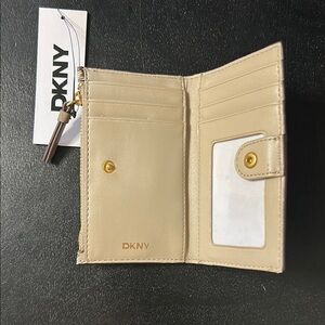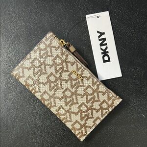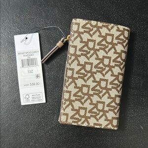 Stylish DKNY Bryant bifold cardholder wallet with monogram design. Features a convenient snap closure and zipper compartment. Perfect for carrying essentials.