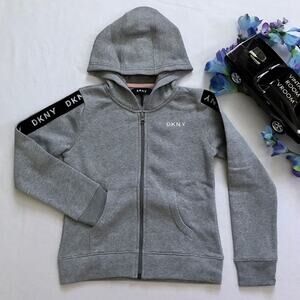 NWOT. Full Zip Hoodie for Girls Size 10. Marled light grey, lined hoodie, split front pockets, long sleeves with brand logo trims, embroidered brand logo front top left, knit construction, ribbed banded cuffs, fleece lined interior. Pictures are part of description.