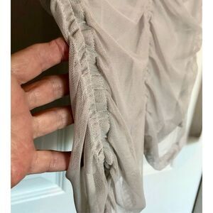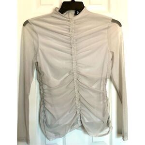 DKNY makes this sizzling hot BodyCon ruched all-over-mesh blouse in ladies EXTRA SMALL. The color is somewhere between light gray and silver. It has a lined bodice and funnel neckline. Elasticized rushing down the middle and on each side, creating a form-fitting silhouette. Sheer sleeves. Hidden zipper in back and scalloped hem. The mesh shell is 83% polyester and 17% spandex. The lining is 100% polyester. Machine wash (cold) on gentle cycle and hang to dry. The pit-to-pit measurement is 18”, the length is 25” and the sleeves are 24. (all without stretching).. This adorable BodyCon top is designed to flatter your curves, and create a mystic vibe. NWT! ♥️