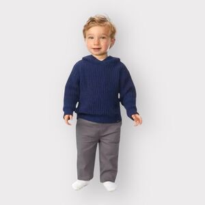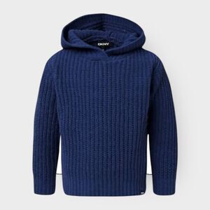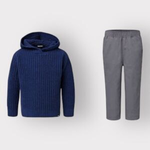 Adorable DKNY navy blue knit hoodie paired with gray pants.