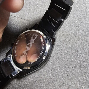 DKNY NY1283 Men's Round Chronograph Watch Black Steel Bracelet Yellow Black Dial working shows signs of wear such as light scratches for small wrist see pictures for reference