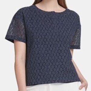 DKNY navy blue lace top, size M. Short sleeve polka dot lace blouse has lined bodice and unlined sleeves. Cool, comfortable, boxy cut top runs a little big. Looks great with jeans, white skirt, jeans or pants for summer! See photos for approximate measurements.
