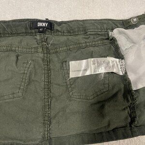 DKNY girls corduroy skirt in olive green, size 4T. Cute gold button-front detail with DKNY embroidery on the pocket. Soft corduroy material with back pockets and belt loops. Two of the front buttons have small scratches (shown in photos), but the skirt still looks adorable overall.