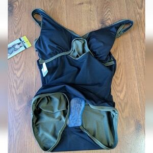Fully lined swimsuit featuring knot detail with key hole cut out in front and shirred waist. Adjustable straps, V neck front with lower scoop back as well. Bust of suit is padded. Brand New with Tags and Modesty Panel.