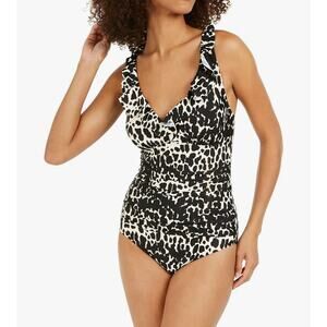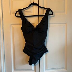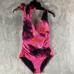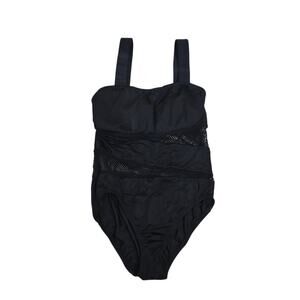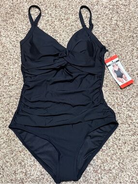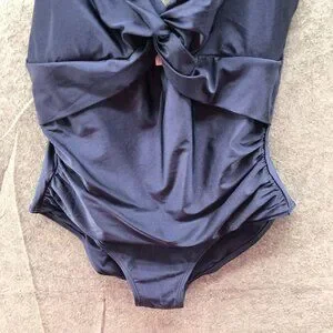 DKNY One Piece Swimsuit Womens XL Navy Blue V-Neck Cut Out Twist Front Ruched
