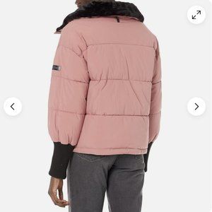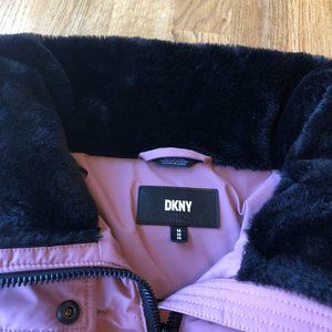 DKNY mauve and black puffer jacket. Stock photos provided for fit and style reference. Really pretty mauve pink color with black trim. Soft, faux fur collar. Size medium. Has outside pockets, inside pocket, and zip front. Light pilling on the ribbed knit cuffs but overall in great used condition! Shell: 100% polyester. Lining: 100% polyester. Filling: 100% Sorona Polyester. Fairly current piece from Fall 2022. Feel free to ask any questions :)