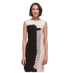 Take color blocking to a whole new level in this sleek, modern style it’s bold, bold brush, stroke, print brings some high impact graphics to the classic shape has crewneck, sleeveless, zip back closure, Him hits above the knee size 8 approximate measurements armpit to armpit 19 inches in length 38 1/2 inches waist 15 inches