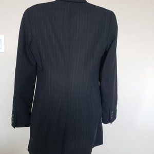 DKNY double-breasted, pin stripe blazer in lack with very subtle deep copper pin stripe. 100% light-weight wool that can be worn year-round. Slightly longer length than standard blazers. Looks amazing with jeans, leggings, pants, skirts and dresses. Like-new condition. Fully lined.