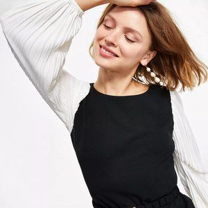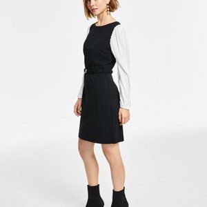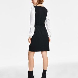 DKNY Pleated-Sleeve Round-Neck Belted Dress Black/Ivory Size 2