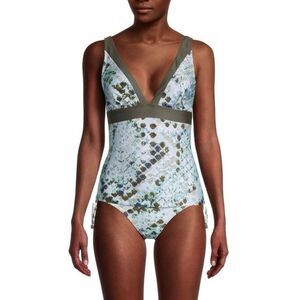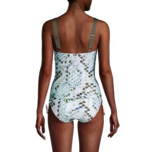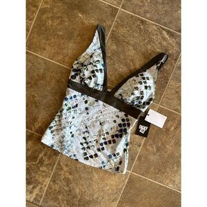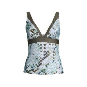 Designed with a unique print, this DKNY tankini features a sporty v-neckline and thick adjustable straps.