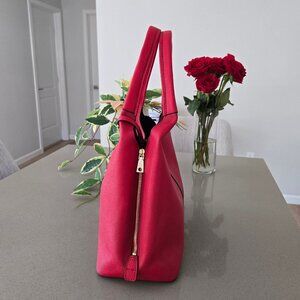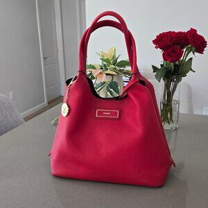 DKNY Red Genuine Leather Zip Side Tote Bag with Pouch Black Interior Gold Logo