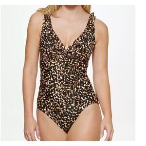 DKNY Printed Ruffle Animal Print Underwire Tummy-Control One-Piece Swimsuit 10 NWT Retails $98