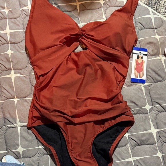 Stylish DKNY one piece swimsuit. Features a rust color with a twist front design. Perfect for a chic beach look.