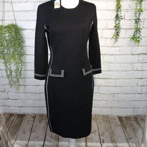 DKNY SWEATER SHEATH FITTED DRESS, BLACK WITH WHITE STITCHING, SIZE SMALL
