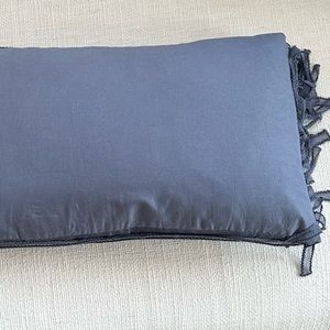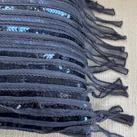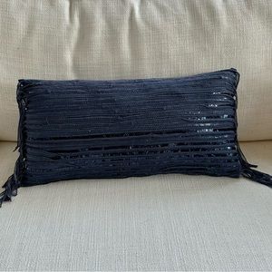 A luxurious five-star finish for any room's decor with this richly-textured, sparkling sequin lumbar pillow from DKNY! Constructed of a silk fabric that gives beautiful drape and coordinating embroidered detail enhance the radiant luster from the sequin. This gorgeous pillow compliments chic modern decor or even pairs well with a shabby chic or coastal look! Reverses to a solid. Built in pillow insert. No flaws. Excellent Pre Loved Condition!