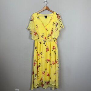 DKNY Shirred Floral Print Crepon Midi Dress Womens 14 Yellow Flutter Sleeve Chic