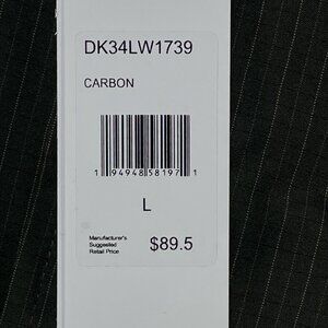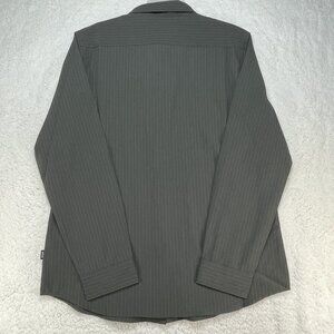 CLEARANCE PRICED! MSRP $79.50. This DKNY men's shirt in size Large is a dark green striped with long sleeves and a spread collar. Made from a polyester blend knit fabric, this button-up shirt also has UPF30 featured protection from the sun's rays, making it a versatile and stylish option for men looking for a designer piece. See the photo for details and measurements.