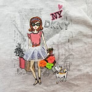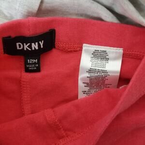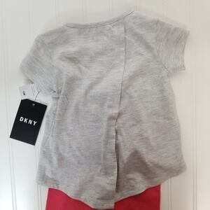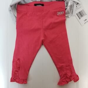 New with tags DKNY outfit. T-shirt, neck snaps, faux back split, pink leggings w/ruffle split hem.