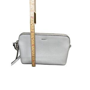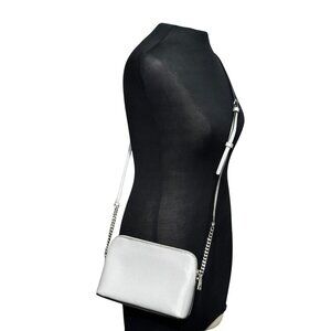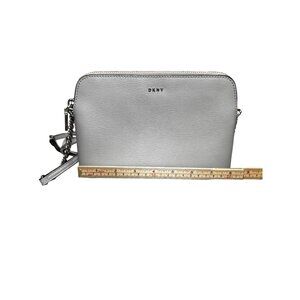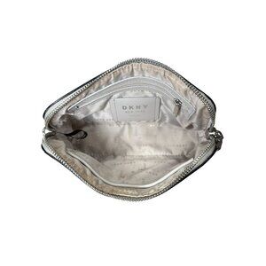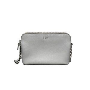 This DKNY crossbody bag offers a sleek and modern design with a metallic silver finish, perfect for pairing with casual or semi-formal outfits. Crafted with quality materials, it features a chain and adjustable leather strap for versatile styling.