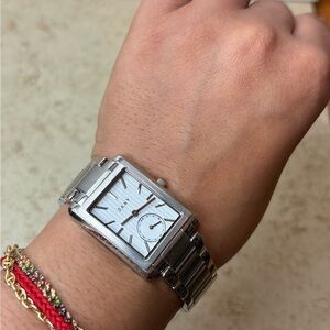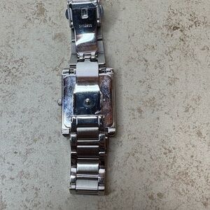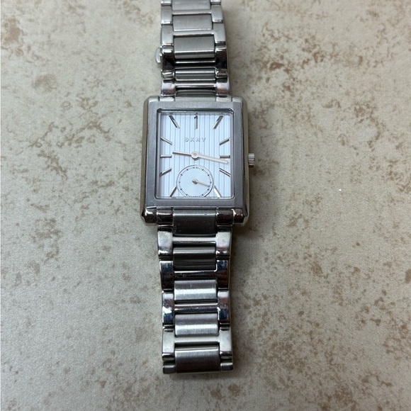 Elegant DKNY watch with a rectangular face. Features a silver metal band. Needs. Battery