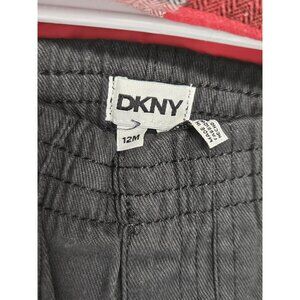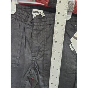 The DKNY Size 12 Months Set of 3 includes a red vest, black pants, and a red plaid button-up long sleeve shirt, perfect for boys in size 12 M. The outfit set features a classic red and black color scheme with a fun plaid pattern, making it ideal for various occasions such as school, holidays, or birthdays. Made from a blended fabric, this outfit set is comfortable and includes pockets for added functionality. With the DKNY brand logo accents, this outfit set is a stylish and versatile addition to any young boy's wardrobe.