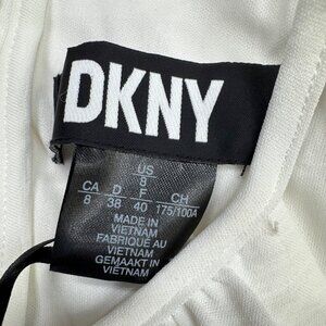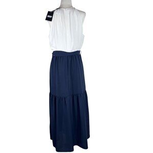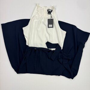 DKNY Sleeveless Dress Midi Size 8 Navy Ivory Fit Flare Tiered Halter Neck