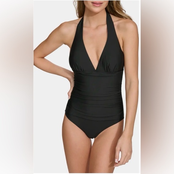 DKNY Solid Black Halter Deep V-Neck One-Piece Bathing Suit Ruched Medium