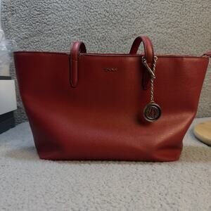 Durable DKNY structured tote shoulder bag crafted in red leather with logo charm for everyday use. Polished classic style ideal for work, travel, or daily carry.