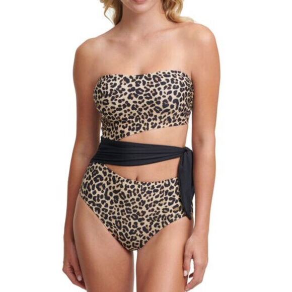 DKNY Suntan Leopard Print Brown & Black Cutout Tie One Piece Swimsuit 10 NWT - New with tags. DOES NOT COME WITH STRAPS. Retails $118