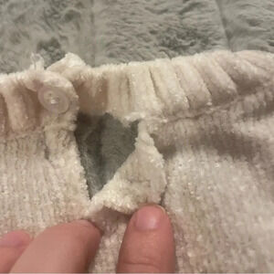Comfy and cute! Chenille sweater and leggings. Some flaws - keyhole in back has a rip, seams coming apart on crotch, and some of the gold lining is coming up - shown In pictures. Leggings have some wash wear. Still has life. No stains.