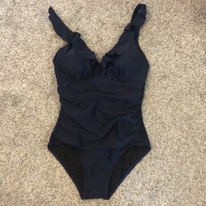 A glam ruffle detail draws the eye on this sleek one-piece by DKNY, a style that fits & flatters in all the right places with its slimming features and solid hue.