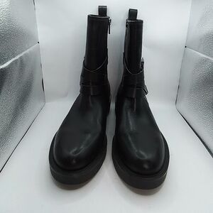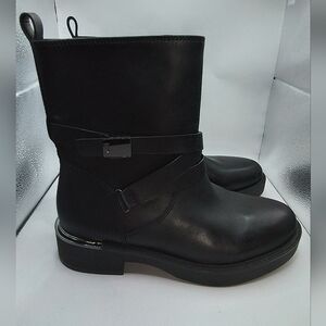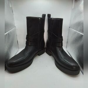 Polished hardware and crisscrossing straps add visual intrigue to a sleek leather bootie lifted by a subtle platform and chunky block heel.