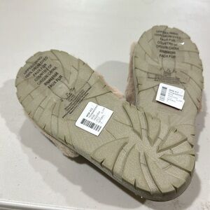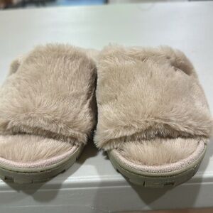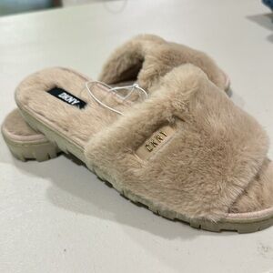Indulge in the luxurious comfort of DKNY's tan slippers, featuring a plush faux fur upper and a durable sole. These open-toe slides are perfect for indoor lounging, offering both warmth and style.