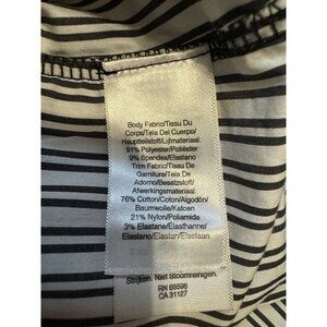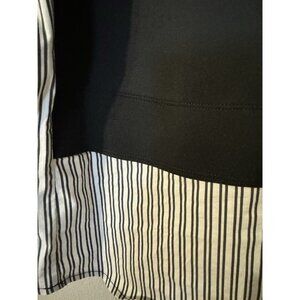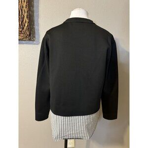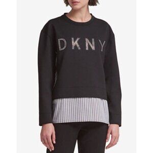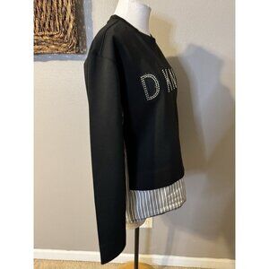 The Everywhere Sweatshirt by DKNY in a size small. 91% polyester and 9% spandex. Machine washable. Black and white stripe shirt fabric sticking out the bottom and sides. Faux crystals as the logo in black, silver and dark blue.