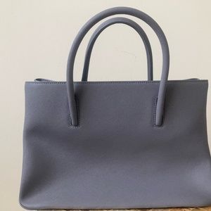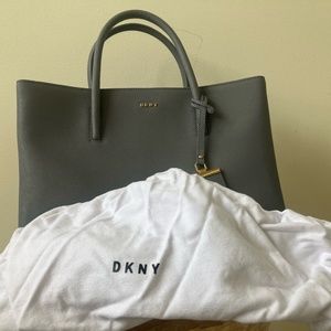 This listing is for a DKNY Tote It is gray with a subtle bluish undertone. Beautiful bag! Brand new and never used! The bag comes with a shoulder strap thus making it easy to carry over the shoulder or by the handles. Bag closes with a magnetic closure. There is a slight mark on the bag (it was a floor model) that was there when I purchased it. As I have not used the bag I have not tried to remove it but wish to point it out as shown in the pictures. Metal feet to protect the bottom. Original dustbag is also included.