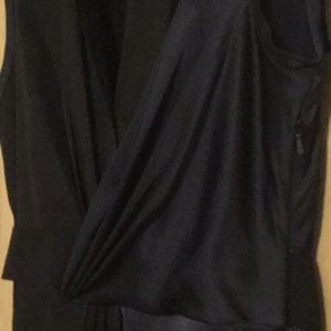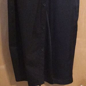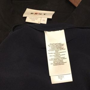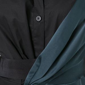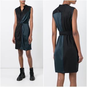 Black stretch cotton twisted front shirt dress from DKNY featuring a band collar, a front button fastening, a color blocked design, a sleeveless design, a fitted waist, a short length and a straight hem.