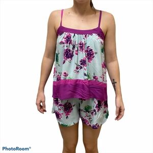 Camisole style top with adjustable straps and short stay bottoms with elasticized/drawstring waistband. Beautiful light blue with purple floral print and accents.