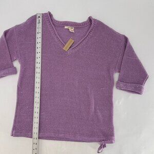 DKNY V-Neck Knit Purple Shimmery Pullover Sweater Size M Preppy Bottom Tie Flaw