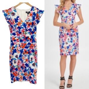 DKNY V-Neck Watercolor Floral Print Ruffle Cap Sleeve Sheath Dress NWT 2