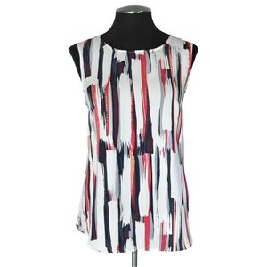Woven style fabric with a white background and a multicolor navy-blue, red, and gray vertical brushstroke stripe pattern throughout. Sleeveless style top with a round neckline, round hem, and keyhole gold button closure in back. Lightweight and unlined with a regular fit. Top is in excellent, like new condition with no flaws. Feel free to ask questions. Save more with bundles!