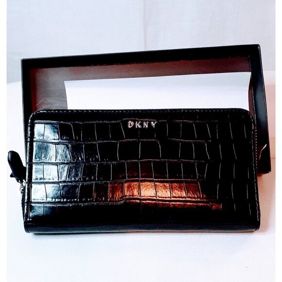 DNKY women black leather wallet zip around at the top zip pocket inside 2 separate departments inside and credit slots NEW