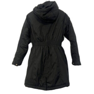Made from polyester with a soft lining, this solid black coat features a zip closure, hood accents, and a regular fit.
