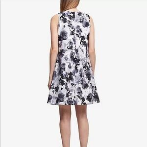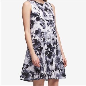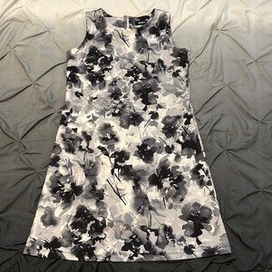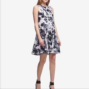 DKNY Watercolor Floral Sleeveless Jewel Neck Black Gray White Cocktail Dress