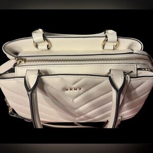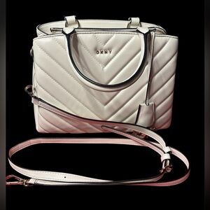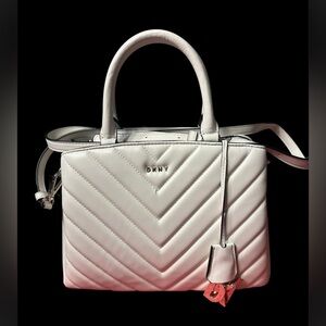 Discover the elegance of the DKNY White Quilted Satchel, featuring a sophisticated chevron stitching pattern. Crafted from high-quality materials, this bag offers a structured design with clean lines, making it a perfect accessory for any occasion. The sturdy handles and luxurious quilted texture add a touch of refinement to your ensemble.