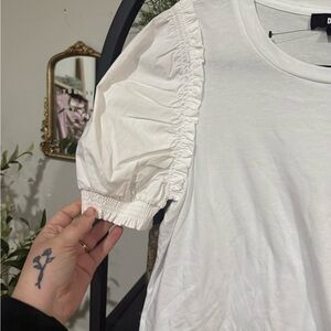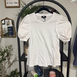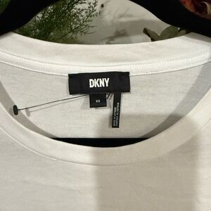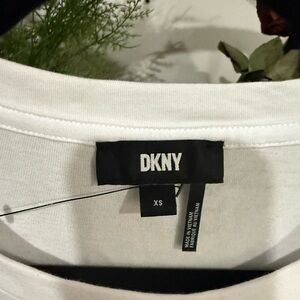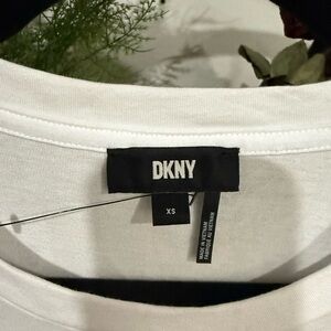 This DKNY blouse showcases a pristine white hue with charming puffed short sleeves, blending elegance with a contemporary flair. Its refined design ensures a comfortable fit, making it a versatile piece for various occasions. Perfect for adding a touch of sophistication to your ensemble.