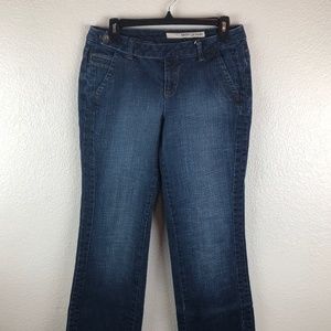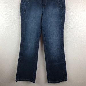 Super cute pair of DKNY Trouser jeans with wide leg. This feature a dark wash, side decorative button, zip-fly, and 5 pockets.