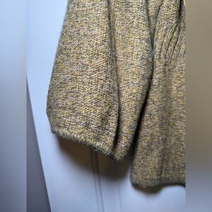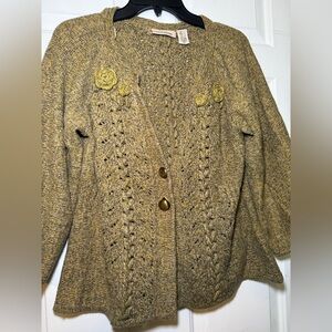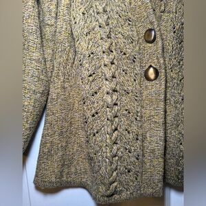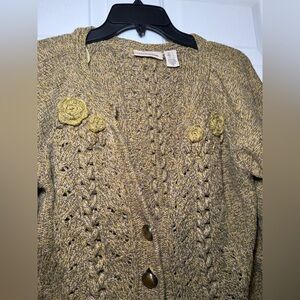 DKNY Woman’s Swing Cardigan size Large Yellow & Gray Chunky Knit V Neck Floral