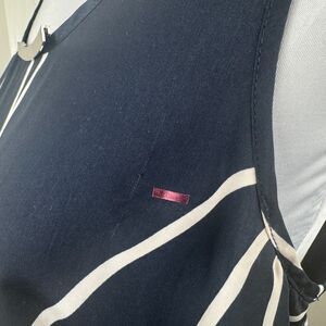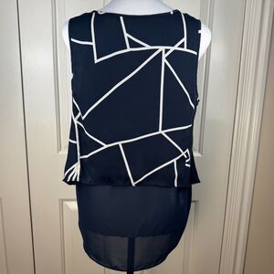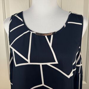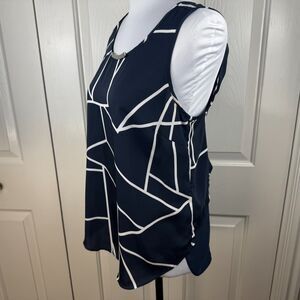 DKNY Women Blouse Sz M Navy Geo Print Round Neck Sleeveless Flowey Sheer Back