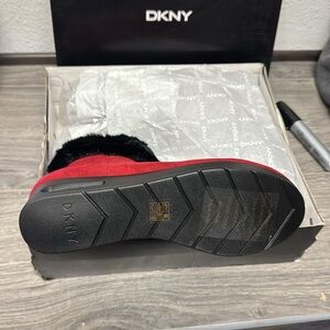 Fluffy faux-fur collars add cold-weather appeal to a sleek wedge lift in the versatile booties from DKNY.