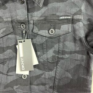 DKNY Women’s Black Camouflage Denim Jacket Size Small. New With Tags! Collar style with 5 buttons, functional chest pockets, long sleeves medium weight, smoke free home